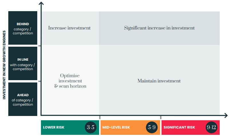 If the score reflects a significant risk, then it’s time to push new growth engines up the agenda. We can plot the score against the level of investment in innovation, new business model innovation or M&A to see the most effective path to growth. We also help clients to develop their next value propositions.