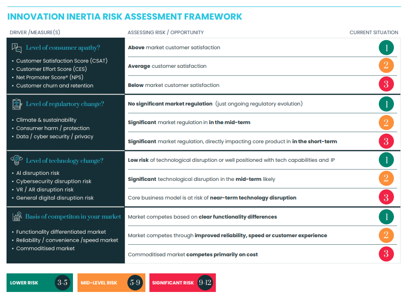 While no two companies have the same priorities and systems; we have fine-tuned a simple framework to help clients sense check innovation inertia risk during their annual planning process.